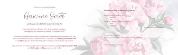 | Een handgeschilderde pioen van Levaro, vol kleur en warmte. Dit ontwerp biedt troost en een persoonlijk eerbetoon. De aquarel brengt een zachte en intieme sfeer. |